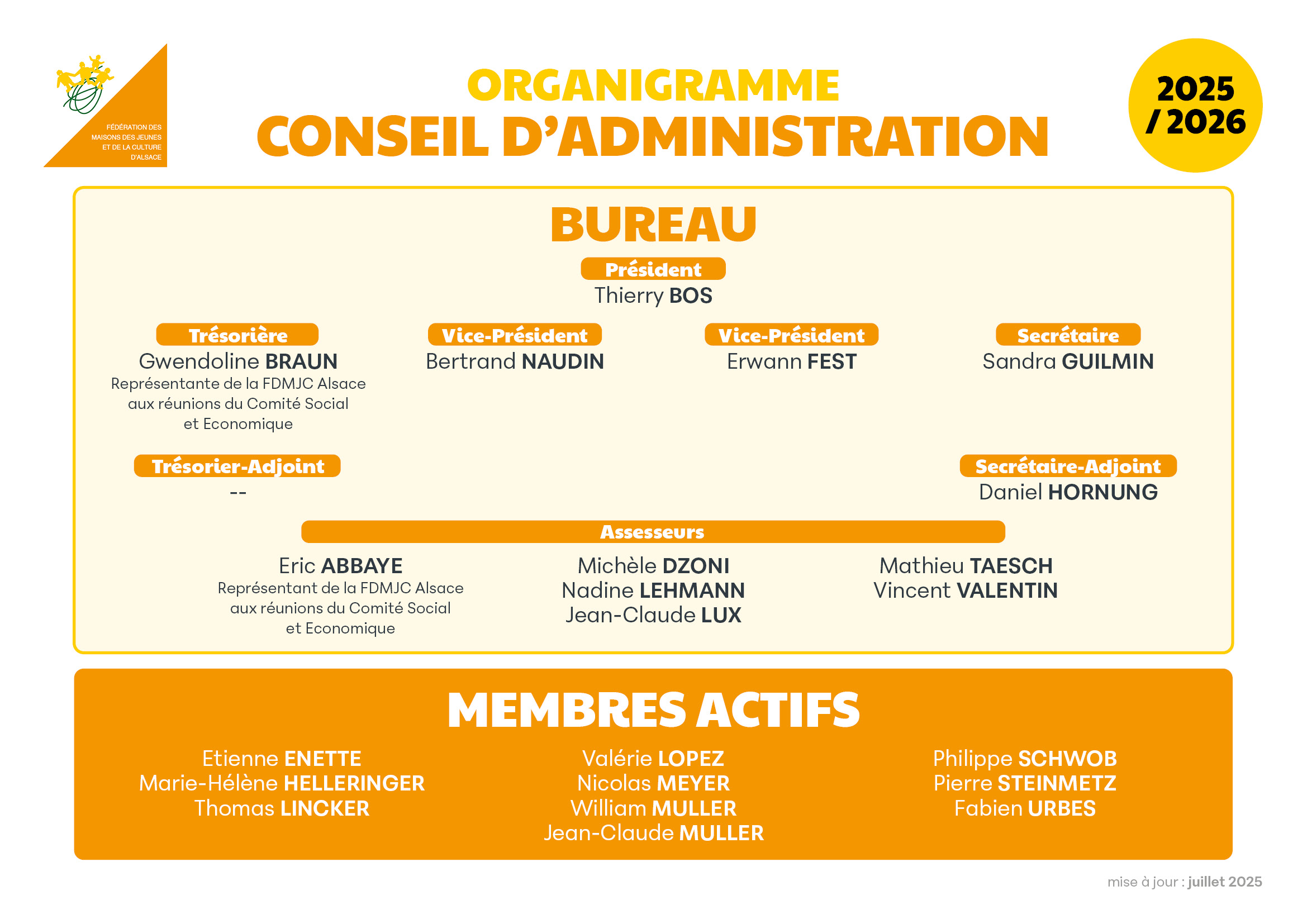 Le Conseil d’Administration est l’instance dirigeante de la FDMJC.